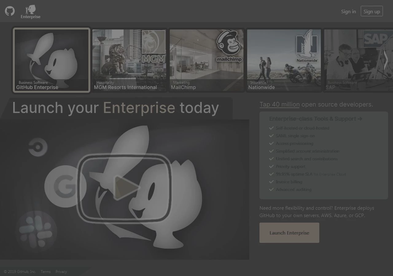 Aug.28.2019 redesign of GitHub's Enterprise landing page and branching content. It also features brand management and marketing strategies to convert existing GitHub users to Enterprise. This requires maximizing content, pageflow (user navigation analytics), and CPM or costs per thousand impressions. NOTE: impressions are measured ad views ('M' is the Roman numeral for thousand in CPM).
